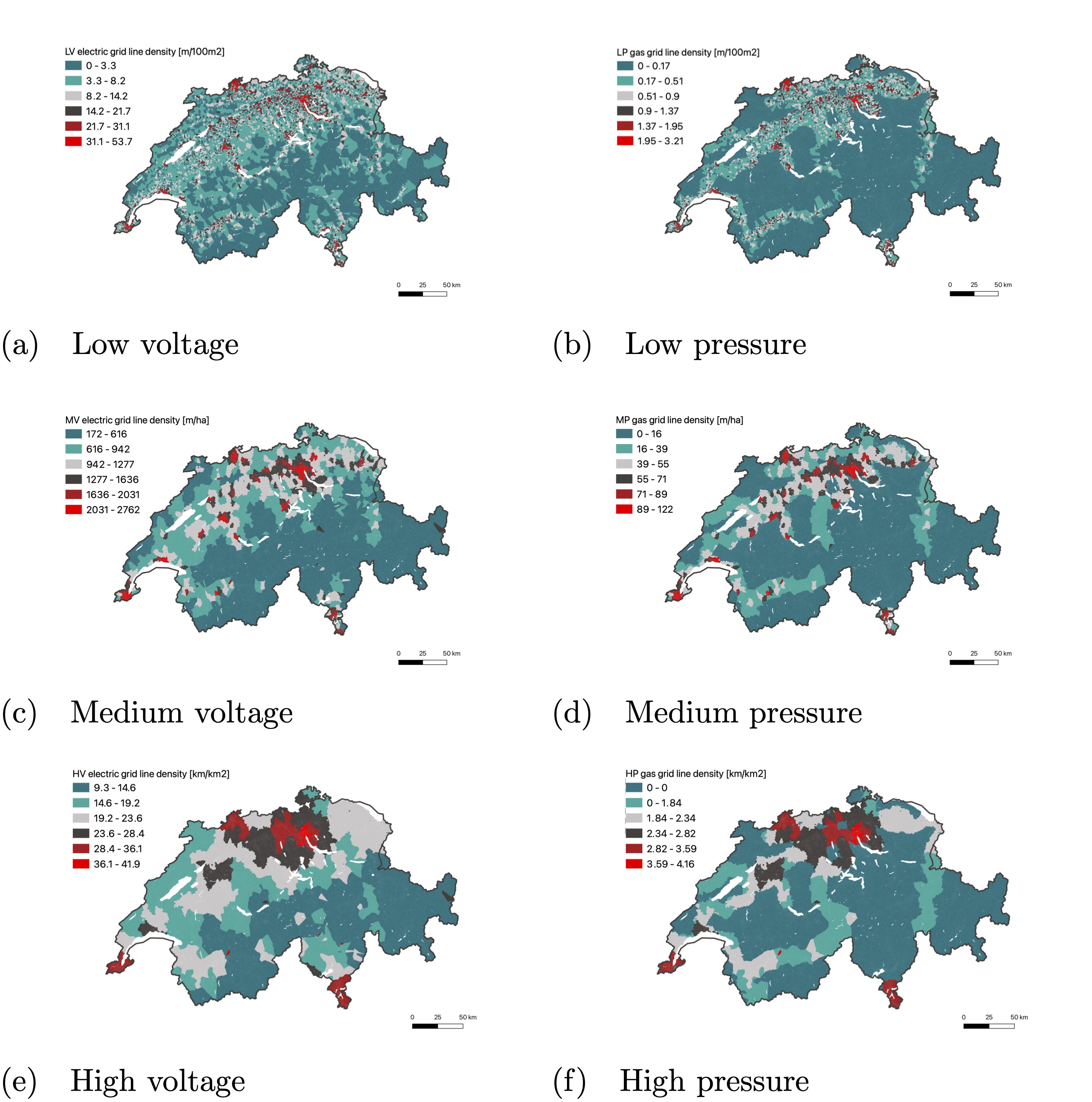 Figure 4: Map of Switzerland with the grid line density estimation using the equidistant method for electric and gas grids.