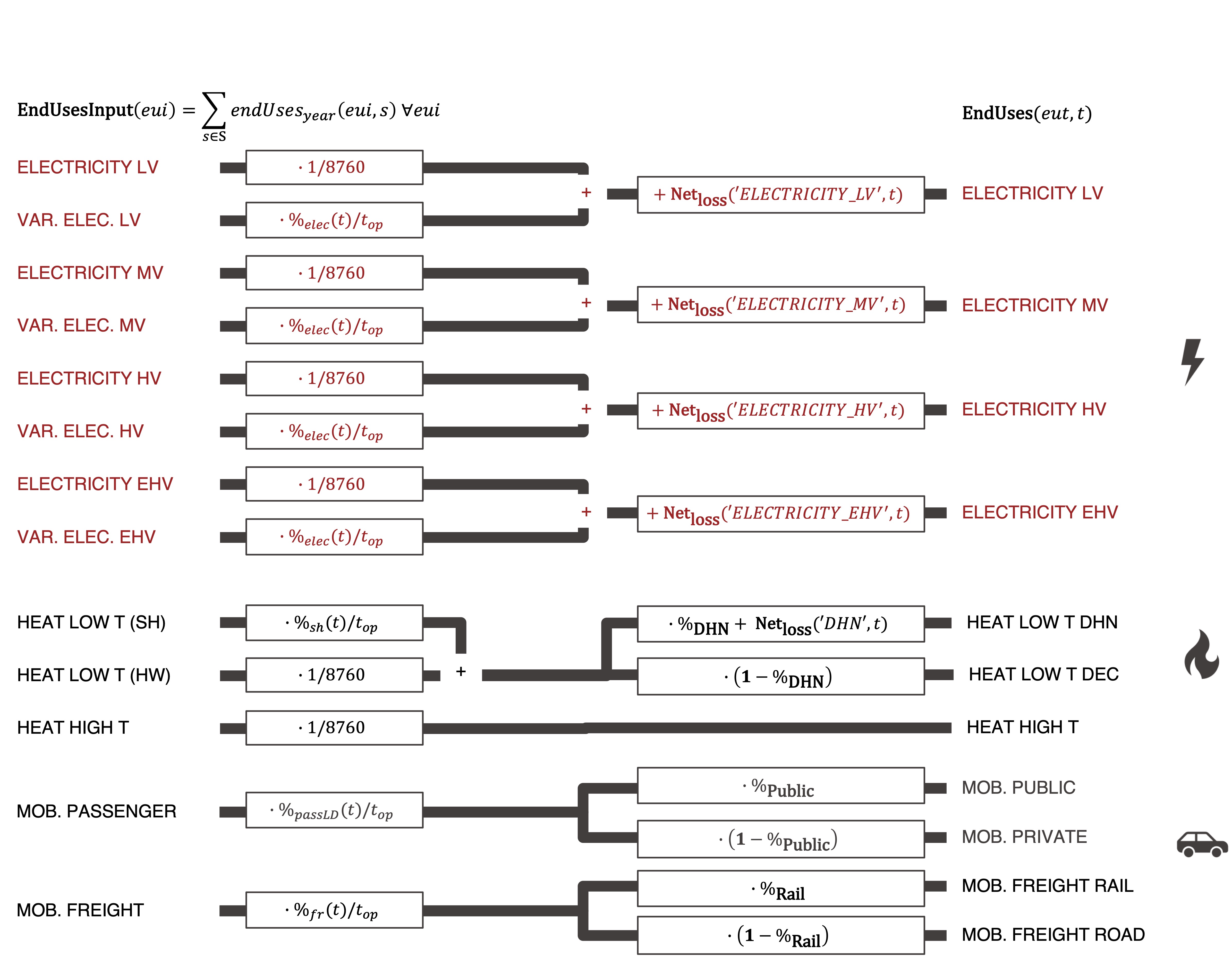 The global annual energy demands are split into households, services, industry, and mobility sectors. These demands are categorized into electricity (four voltage levels), space heating, hot water, process heat, passenger transport, and freight transport (see Figure 6). The end-use demands \( \mathbf{END \, USES} \) are satisfied by energy conversion technologies, storage, and grid losses: