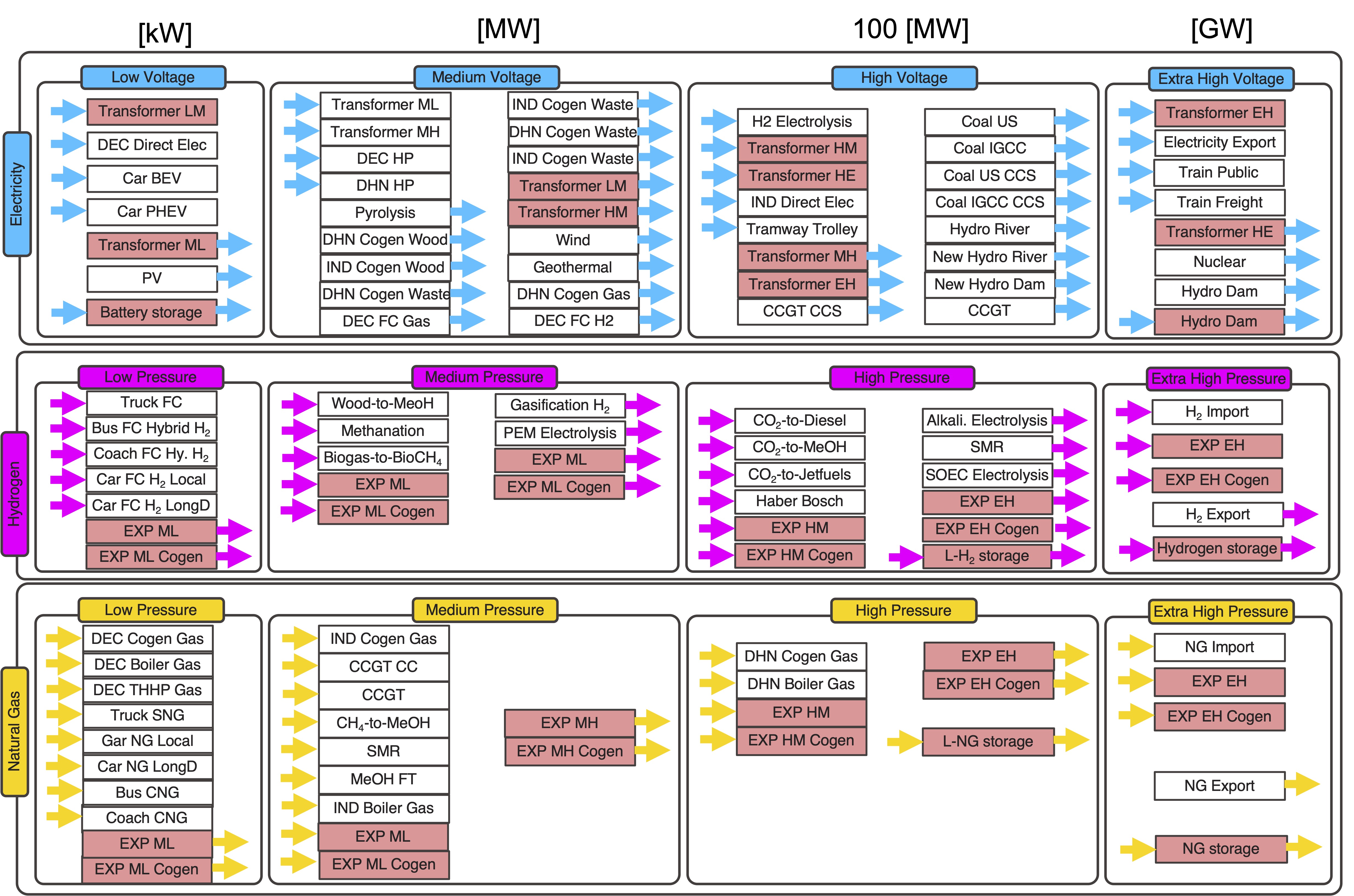 Electrical, methane, and hydrogen infrastructures have been modeled, each split into four power levels (e.g., voltage in electric grids and pressure in gas grids), characterized by the distributed power capacity \( \mathbf{S_g}^{max} \;\mathrm{[GW^{inst}]} \), following the discretization of Swissgrid 2020 ⧉ for the electric grid and Swissgas 2018 ⧉ for the gas grid.