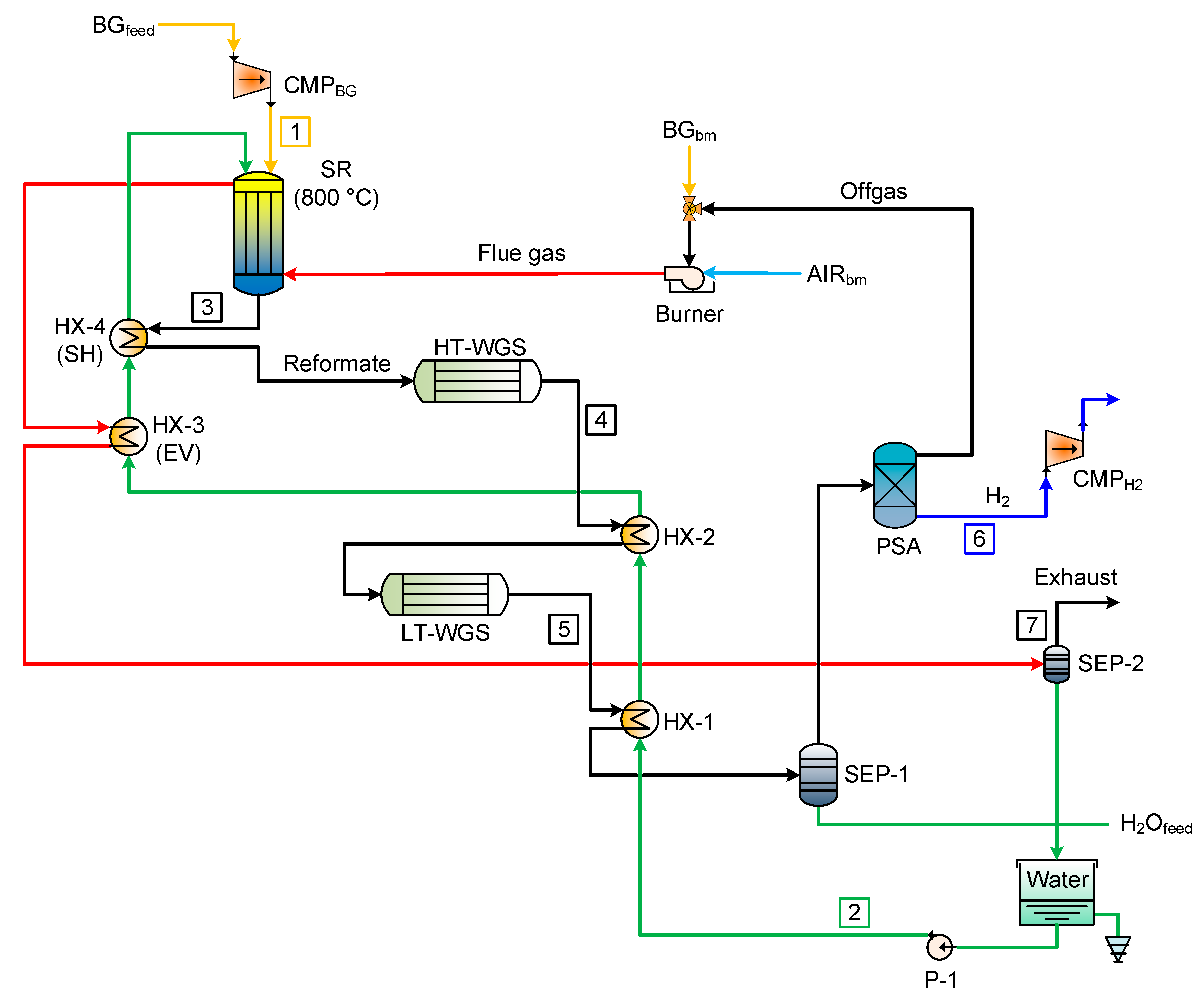 In the Steam Methane Reforming (SMR) process, depicted in Figure 1a, natural gas is combined with high-pressure steam and introduced into reforming tubes containing catalysts conducive to the reforming reactions. These reactions are inherently endothermic, necessitating the integration of a furnace within the reforming section to provide the essential thermal energy. The fuel for this furnace is sourced from natural gas and the purge stream from the Pressure Swing Adsorption (PSA) unit.